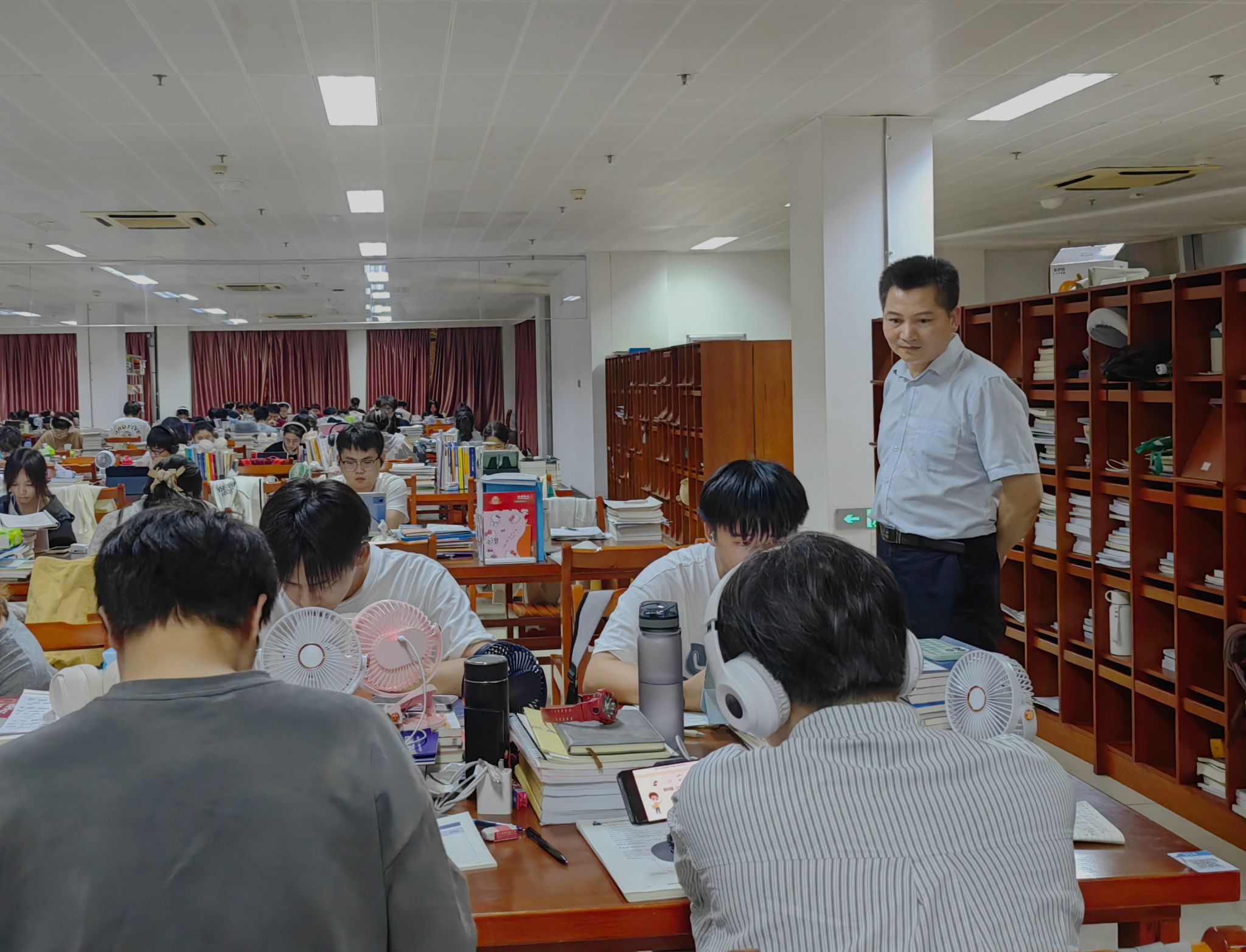 当晚九点,图书馆座无虚席,留校学生们全心投入学习。伍复康轻步巡视,看到同学们专注学习的场景后,特别强调,各相关部门和二级学院要聚焦备考学生实际困难,在座位调配、专业指导等方面精准发力,为学生冲刺保驾护航。