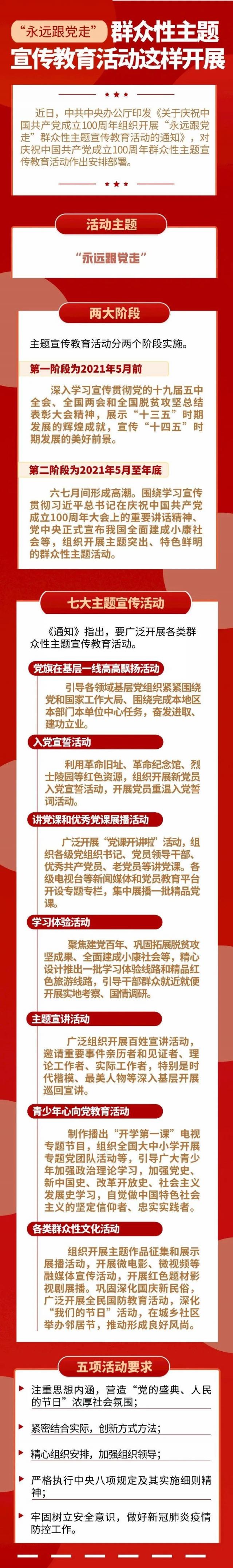 《通知》强调,以“永远跟党走”为主题,组织开展形式多样、内容丰富的群众性主题宣传教育活动,大力唱响共产党好、社会主义好、改革开放好、伟大祖国好、各族人民好的时代主旋律,激励和动员全党全军全国各族人民更加紧密地团结在以习近平同志为核心的党中央周围,不忘初心、牢记使命,开拓奋进、攻坚克难,立足本职岗位作贡献,把爱党爱国爱社会主义热情转化为实际行动,为确保“十四五”开好局、起好步,为全面建设社会主义现代化国家、夺取新时代中国特色社会主义伟大胜利、实现中华民族伟大复兴的中国梦而继续奋斗。