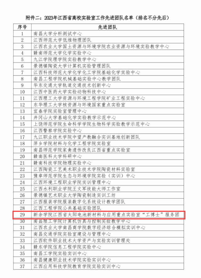 近日,2023年江西省高校实验室工作先进单位、团队、个人及突出贡献奖评选结果揭晓,开云推送的《开云kaiyun官方网站江西省太阳电池新材料与应用重点实验室“工博士”服务团》荣获先进团队奖。