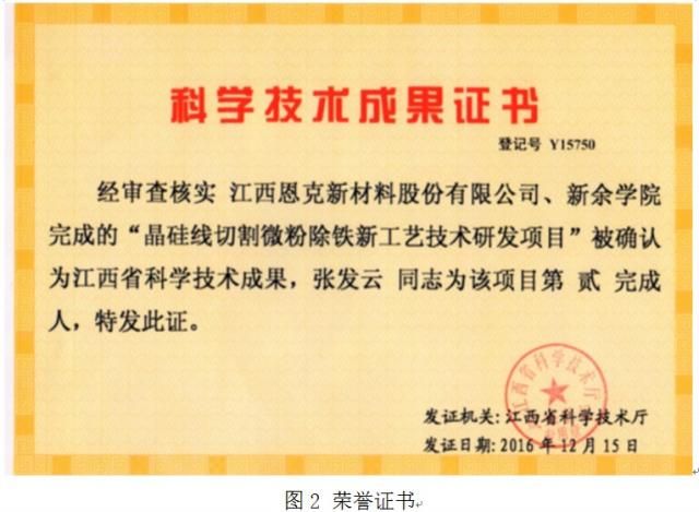 团队经过两年合作研究,对多晶硅线线切微粉生产工艺进行技术革新,解决了公司微粉切割技术难题和生产回收工艺。与此同时,2016年经过新余市科技局组织专家鉴定,技术水平达到国内领先,校企合作完成的“晶硅线切割微粉除铁新工艺技术研发项目”荣获了江西省科学技术成果。通过校企合作,学校为企业解决了技术难题,为地方经济建设做出了一定的贡献,取得了良好的经济效益和社会效益。