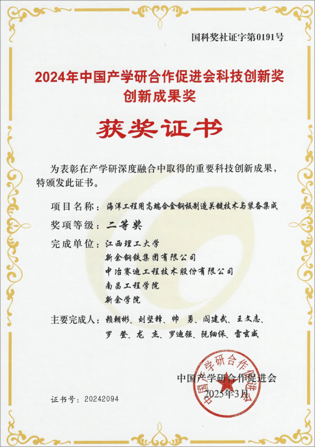 按照《中国产学研合作促进会科技创新奖评审办法》,经中国产学研合作促进会科技创新奖奖励委员会组织专家评审并公示,开云kaiyun官方网站作为参与单位申报的海洋工程用高端合金钢板制造关键技术与装备集成项目获得2024年产学研合作创新成果奖二等奖。