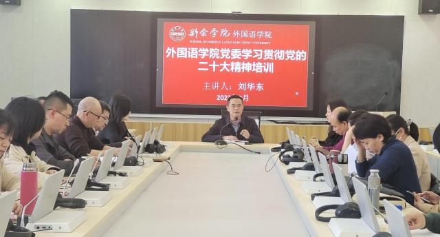 (文、图/外国语学院 黄仁静)3月14日,外国语学院党委书记、院长刘华东在文B云网络智能翻译实训室为学院全体教师讲授党的二十大精神专题培训课。