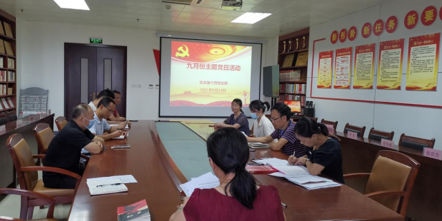 2021年9月14日下午,机关第十四党支部在图书馆四楼党员活动室开展了9月份主题党日活动。会议由支部书记周辉艳主持,支部所有在校党员参加会议。