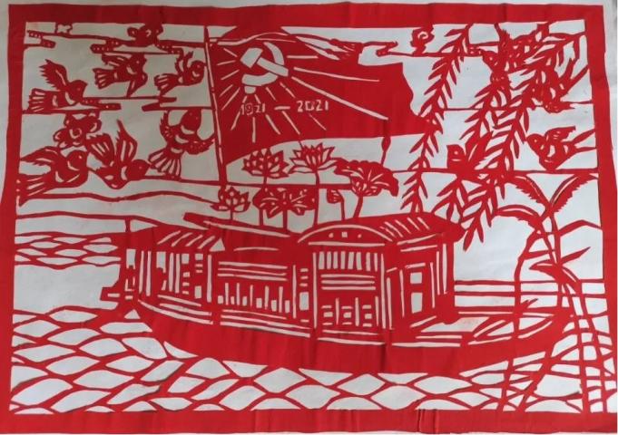 作品《红船启航》还原了在1921年7月底,中国共产党第一次全国代表大会由上海转移到嘉兴南湖画舫举行的历史时刻,庄严宣告了中国共产党的诞生。作品《剪艺颂华诞》中,党旗党徽以及庆祝建党百年的标语跃然纸上。创作者表示,鲜花、红船、党徽、建党100周年等标识元素,充分体现了在中国共产党的坚强领导下,国家实现了站起来、富起来再到强起来的沧桑巨变。