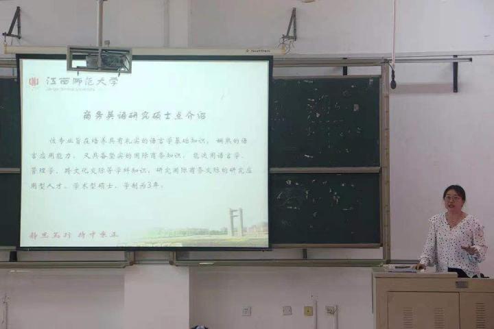黄淑娟介绍了江西师范大学国际教育学院的基本情况,并对本次宣讲会的主要内容进行了简要说明。紧接着,孙旭红从江西师范大学的历史沿革、国际教育学院相关硕士点建设、商务英语研究硕士点介绍、商务英语研究专业优势以及同学们关注的国家有关研究生的最新政策等方面进行了详细的宣讲解读。孙旭红给同学们分析了江西师范大学国际教育学院近几年的研招政策和基本情况,希望同学们能够把握机会,成功上岸。
