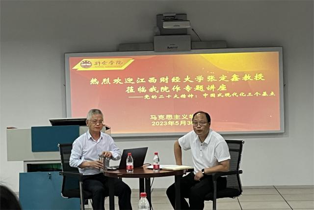 为深入推进“学习贯彻习近平新时代中国特色社会主义思想”主题教育,提升学院教师学习、研究、阐释、宣传习近平新时代中国特色社会主义思想的能力和水平。5月30日,马克思主义学院邀请江西财经大学马克思主义学院张定鑫教授作题为“中国式现代化三个基点”的专题讲座,学院全体教师参加。讲座由院长潘欧文主持。